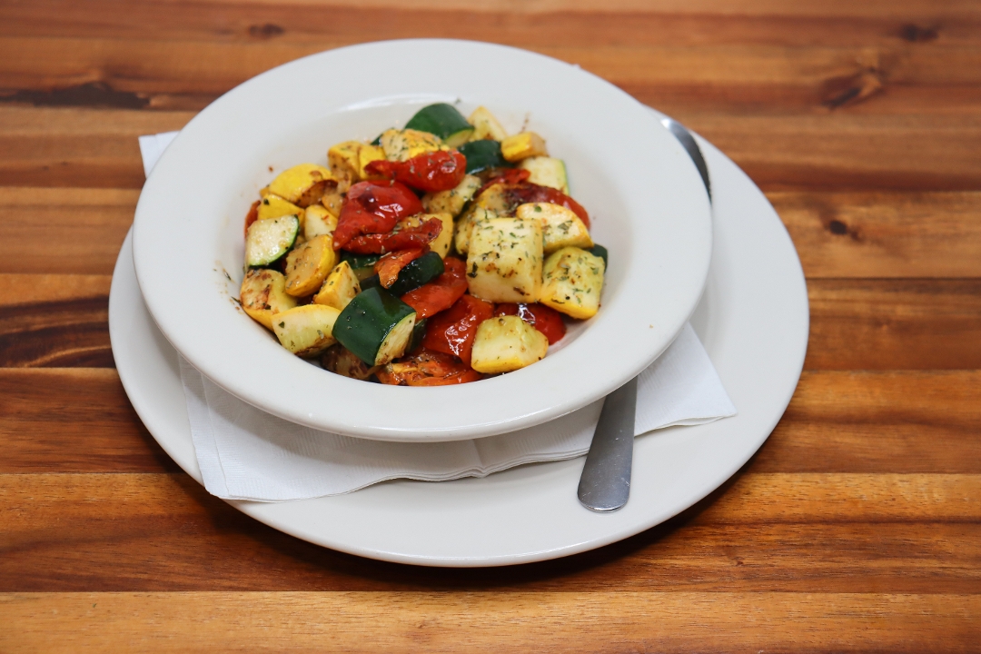 Beets, carrots, portobellas, spring mix, asparagus, bleu cheese crumbles, candied pecans, fried pickled red onions & balsamic glaze.