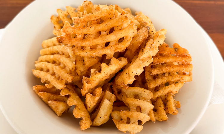 Two chicken strips lightly breaded and golden fried accompanied with your choice of waffle fries, garlic mashed potatoes, house-made potato chips, Cole slaw, or fresh apple slices.