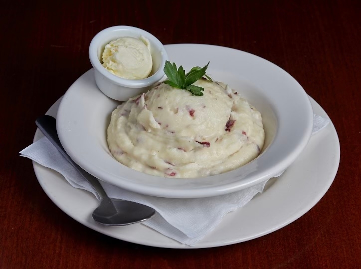 Sirloin topped with steak butter sauce and served with Bordelaise sauce, house-made garlic mashed potatoes & seasonal vegetables.